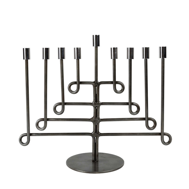 Celebrate the festival of lights with a modern twist on tradition. Our Antiqued Twisted Iron Menorah features handcrafted black iron with polished silver cups, giving a fresh and minimalist take on the classic form. Add a unique touch to your Hanukkah decor with this elegant piece.