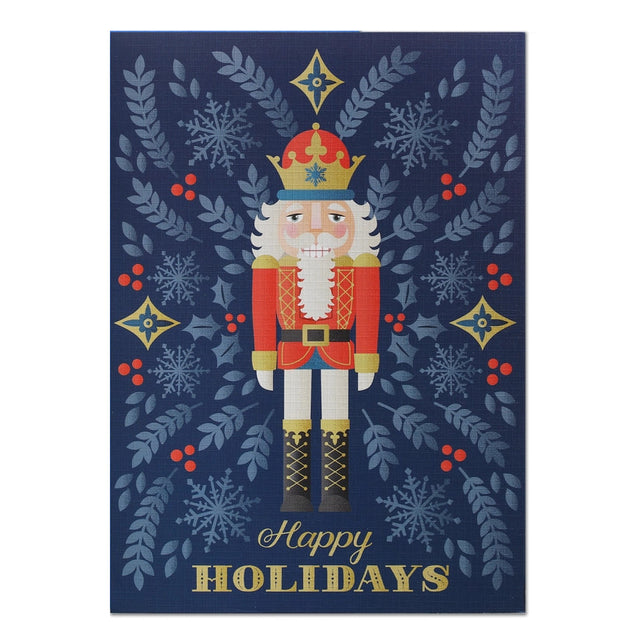 These Nutcracker Fantasy holiday cards feature a charming Nutcracker surrounded by whimsical folk art designs, bringing a festive, storybook feel to your greetings. Printed in rich, full color on bright linen-textured stock, each card captures the magic of the season. The set includes 16 cards and envelopes and comes in a matching keepsake box with a convenient magnet closure—perfect for gifting or storing your cards year after year.