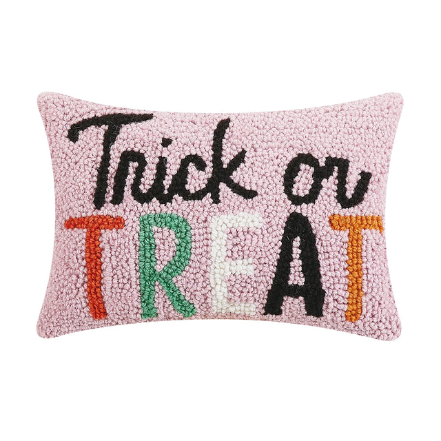 Get your home Halloween-ready with this spooktacular Trick or Treat Hooked Pillow! This high-quality, hand-hooked wool pillow comes with a soft velvet backing and polyester insert, making it both comfortable and stylish. The playful "Trick or Treat" design in candy colors will add the perfect touch of whimsy to your home haunt.