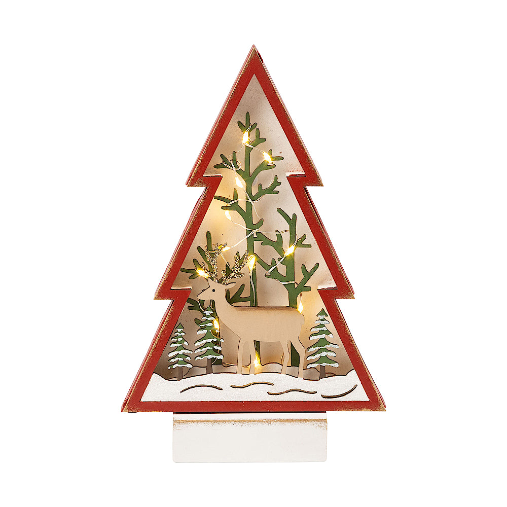 Featuring a wood tree and stag table piece, this Scandinavian style piece will bring a touch of nature indoors. The red frame and green forest scene are beautifully illuminated with LED lights, adding warmth to your tabletop display.