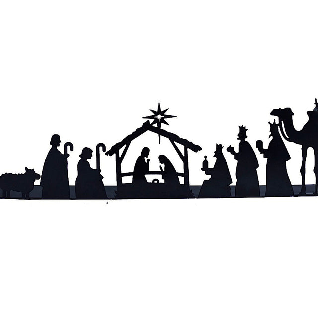 Elevate your holiday decor with this Metal Nativity Scene, ethically handcrafted by artisans in India. Made from repurposed sheet metal, each piece is dipped in black for a stunning silhouette look. This intricately designed decoration utilizes metal working, wrapped wire, and fabric stitching. Add tea lights behind the scene for a warm and cozy ambiance. Perfect for adorning your mantle.