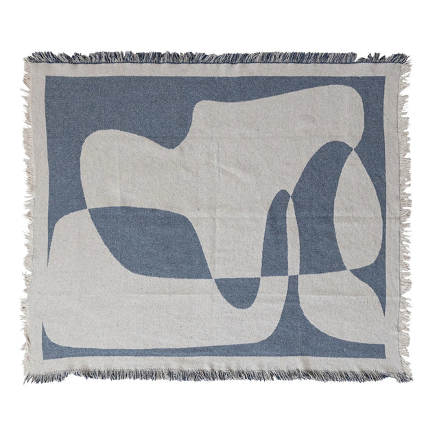 Add modern style to your space with this woven recycled cotton blend jacquard throw in natural and blue. The bold abstract design features soft, flowing shapes that feel fresh and relaxed. Made from a recycled cotton blend, it offers comfortable warmth with a thoughtful touch. Finished with eyelash fringe, this throw layers effortlessly over a sofa or bed for a calm, contemporary look.