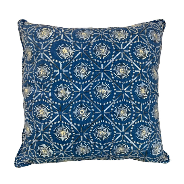 This royal blue throw pillow features a hand block printed design rooted in traditional Indian textile craftsmanship, created on 100% cotton for rich color and soft texture. The geometric motif adds structure and visual interest, reflecting the precision and artistry of block printing techniques passed down through generations. Fully printed on both sides and finished with a hidden zipper closure, it pairs easily with a range of styles. Each piece is handcrafted by skilled artisans, making every pillow subtly unique. Includes a pillow insert for a complete, ready-to-style accent.