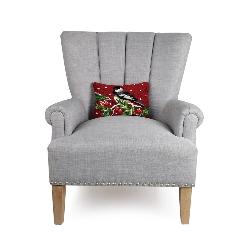 Bring cozy woodland charm to your holiday décor with this beautifully crafted hooked accent pillow. Featuring a black-capped chickadee perched on a holly branch against a snowy red background, it captures the peaceful beauty of winter. Handcrafted from 100% wool with a soft velvet backing, this pillow includes a plush polyester insert and a convenient zipper closure, making it perfect for adding warmth and texture to any chair, sofa, or reading nook.