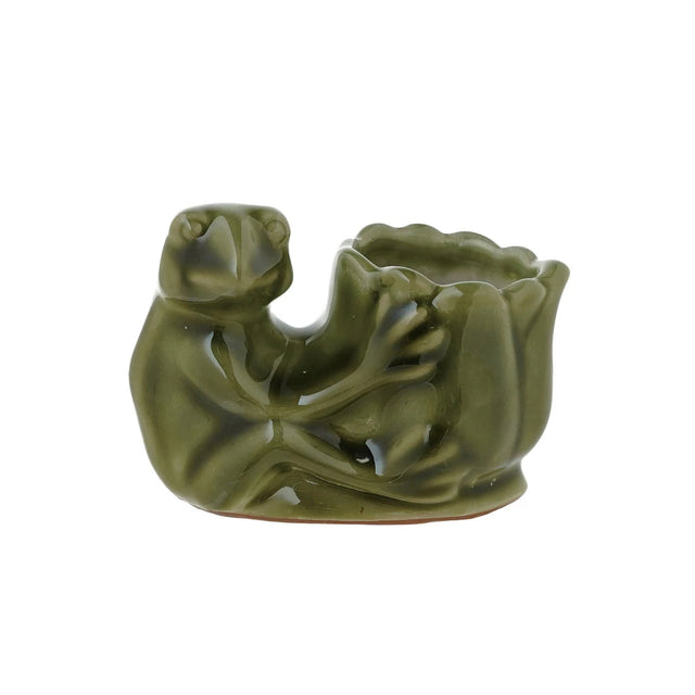 Bring a touch of storybook charm to your space with this stoneware frog holding a flower shaped vase, finished in a rich green reactive glaze that makes every piece beautifully unique. The glossy, organic tones highlight the sweet expression and sculpted details, creating a whimsical accent that feels both earthy and artful. Perfect for a petite bouquet of fresh or dried blooms, a few garden clippings, or even a single delicate stem, it also works beautifully as a charming holder for toothpicks, cotton swabs, or other small essentials on a vanity or countertop. Display it on a shelf, bedside table, or powder room sink to add personality and a gentle hint of nature to any corner of your home.