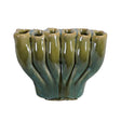 Showcase your stems in a more artful way with this stoneware sculptural vase featuring six individual sections. The fluted design keeps flowers beautifully separated, creating a fuller, thoughtfully arranged look with minimal effort. Finished in a green reactive glaze, each vase has its own unique blend of tones and subtle variations. Compact yet eye catching, it adds organic shape, rich color, and a fresh botanical feel to any tabletop or shelf.